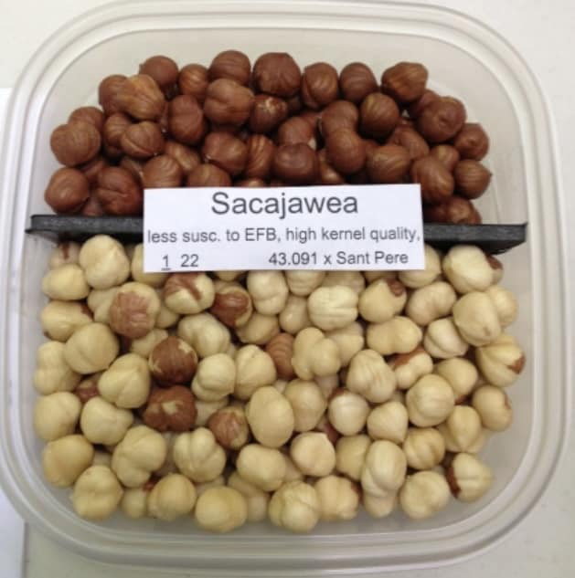 Dereva «Sacajawea» buly ≈86% vid rozmiru sylnorosloho standartu «Barcelona» i bilshi, nizh «Lewis» (65%) i «Clark» (59%), yakshcho vymiryaty ploshchu poperechnoho pererizu stovbura, 30 sm nad liniyeyu gruntu, naprykintsi somoho vehetatsiynoho sezonu (hruden 2005). Vony mayut bazhanu kulyastu zvychku rostu, yakoyu maye buty lehko keruvaty v komertsiynomu fruktovomu sadu, ale chas vid chasu potribno obrizaty, shchob sonyachne svitlo pronykalo kriz poloh. Zahalna vrozhaynist horikhiv z dereva (z tretoho po somyy lystok) stanovyla 15,1 kh dlya «Sacajawea» proty 16,1 kh dlya «Barcelona» abo 93,9% vid kontrolyu. Efektyvnist urozhaynosti, yaka vrakhovuye riznytsyu v rozmirakh derev shlyakhom dilennya vrozhaynosti na ploshchu poperechnoho pererizu stovbura, bula trokhy vyshchoyu dlya «Sacajawea» (0,147 kh·sm 2 ), nizh dlya «Barcelona» (0,136 kh·sm 2 ), abo 108,5% vid kontrolyu. Trokhy blyzhche roztashuvannya derev u sadu bulo b dotsilnym, shchob otrymaty vyshchu efektyvnist urozhayu. Oskilky vidsotok yader (spivvidnoshennya vahy yadra do masy horikha) ( Tablytsya 2 ) znachno vyshchyy dlya «Sacajawea» (52%), nizh dlya «Barcelona» (43%), urozhaynist yader z akru bude vyshchoyu, nizh dlya «Barcelona».Horikhy «Sacajawea» skladayutsya v kysti po dva-try v lushpynni, shcho dorivnyuye dovzhyni horikhiv. Lushpynnya zrizane zboku, i ≈97% horikhiv vilno rozpadayutsya pislya zrilosti. Horikhy hotovi do mekhanichnoho zbyrannya za 10-14 dniv do «Barselony» abo pryblyzno na tretiy tyzhden veresnya v Korvallisi, Orehon. Bilsh rannye dozrivannya ye znachnym pokrashchennyam, oskilky v bilshosti rokiv zbyrannya vrozhayu «Sacajawea» zavershuyetsya do pochatku sezonu doshchiv, yakyy zbihayetsya z pochatkom zboru vrozhayu «Barcelona».